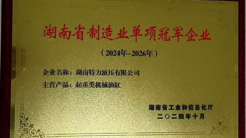 近日,公司憑借著起重類機械油缸的卓越技術實力和市場領導地位,正式被湖南省工業和信息化廳授予“湖南省制造業單項冠軍企業”榮譽,標志著我司成為該細分領域的標桿企業。